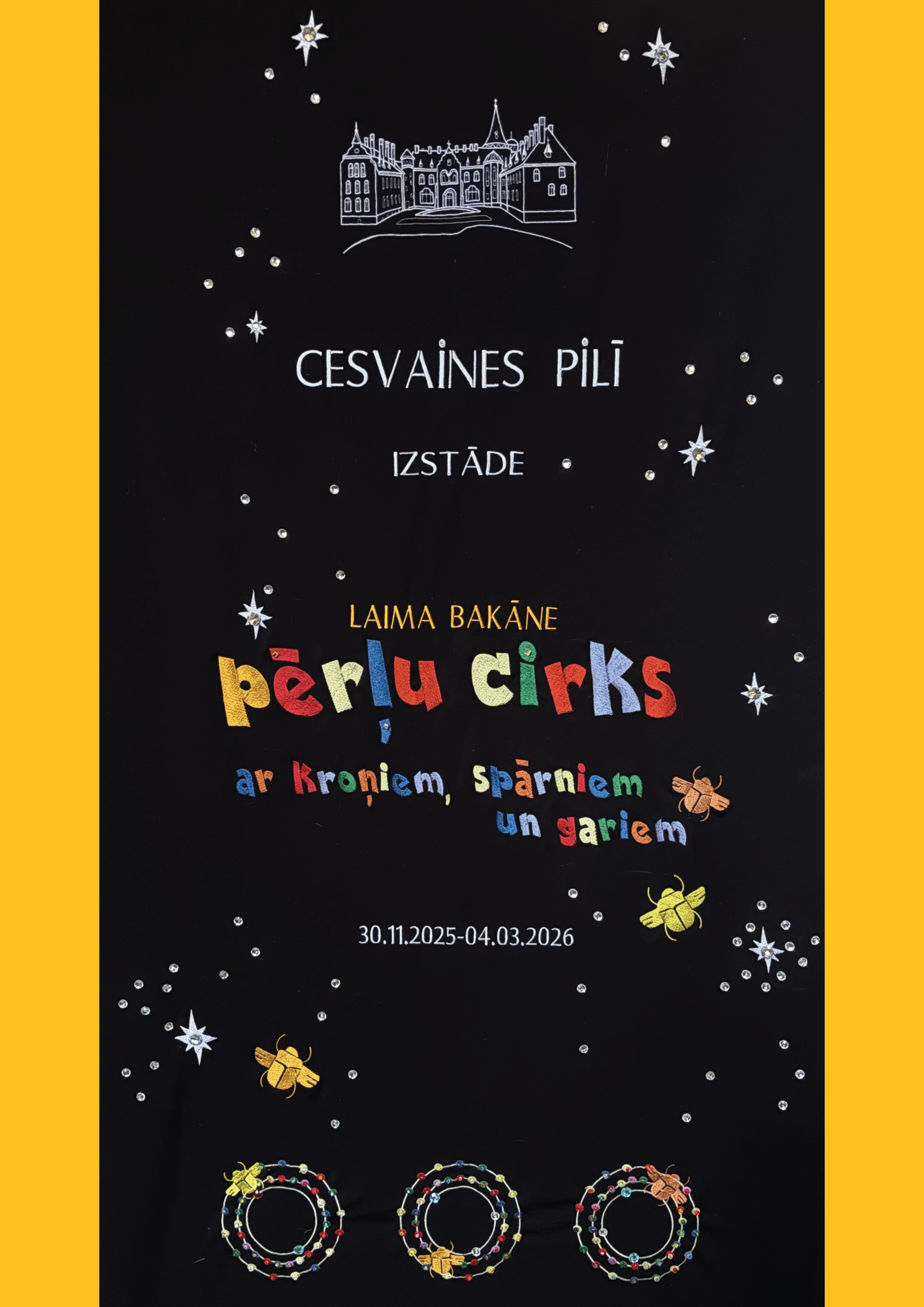 Izstādē sastopami adventes kroņi, cirka bumbas, pērļu virtenes un visdažādākie dekori — putnu spārni, lidojoši skarabeji un zupas gariņi, katrs ar savu humoru un vieglu maģijas piesitienu. Darbi tapuši pusotra gada laikā, īpaši domājot par Cesvaines pils zāli — tās gaismu, logiem un telpas neatkārtojamo noskaņu.